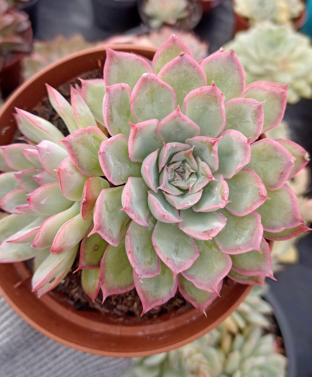 - Rosetas Compactas: As folhas formam rosetas compactas e simétricas, com um formato arredondado e pontas levemente pontiagudas.