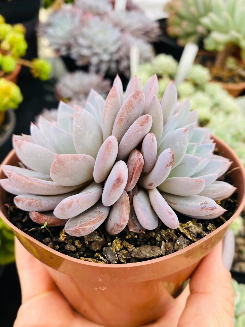 A Echeveria 'Lulu' é uma suculenta encantadora conhecida por suas folhas compactas e suculentas, que formam uma roseta simétrica de cores vibrantes. Ideal para colecionadores e entusiastas de plantas, ela traz um toque de elegância e beleza a qualquer ambiente.